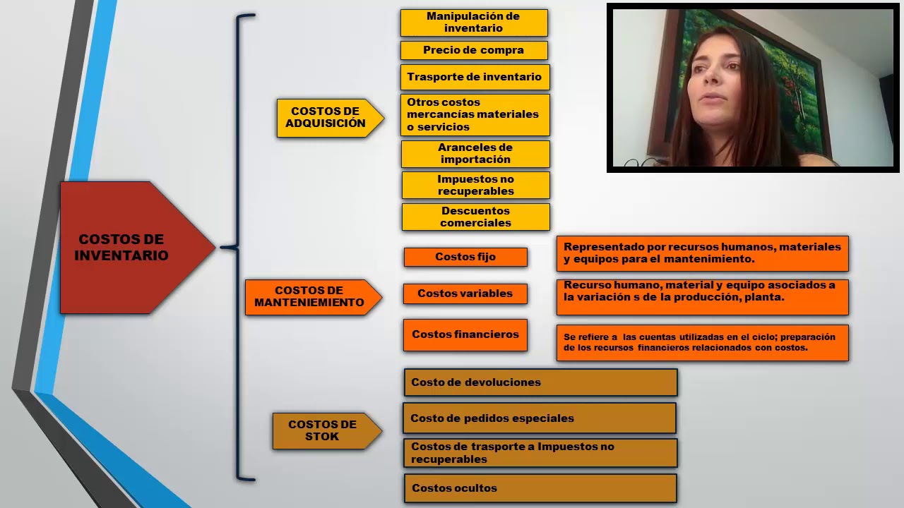 El costo de inventario está compuesto por el precio de compra de los productos y los gastos adicionales asociados con su almacenamiento, como almacenamiento, manejo, seguros, obsolescencia y deterioro.